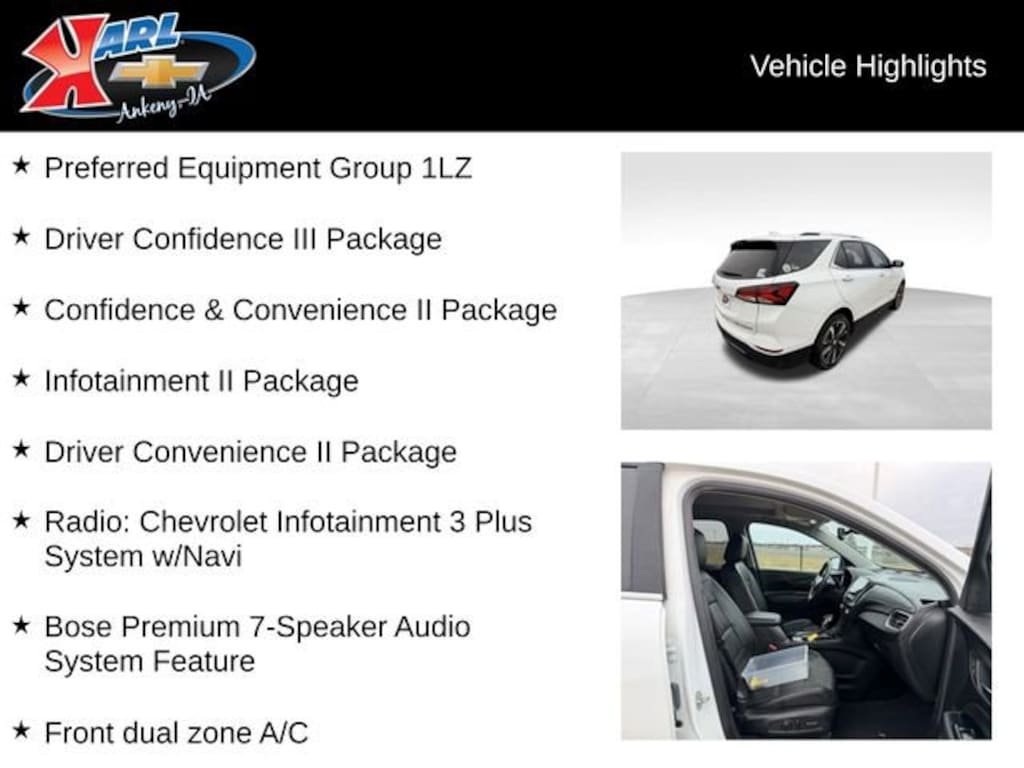 As a CarBravo Certified vehicle, this Equinox has undergone a comprehensive 126-point inspection and comes with a 12-month/12,000-mile bumper-to-bumper limited warranty, 24/7 roadside assistance, and a 10-day/500-mile exchange promise. Experience the peace of mind and premium protection that come with owning a certified pre-owned Chevrolet from Karl Chevrolet of Ankeny, the Nation's #1 CarBravo Dealer.