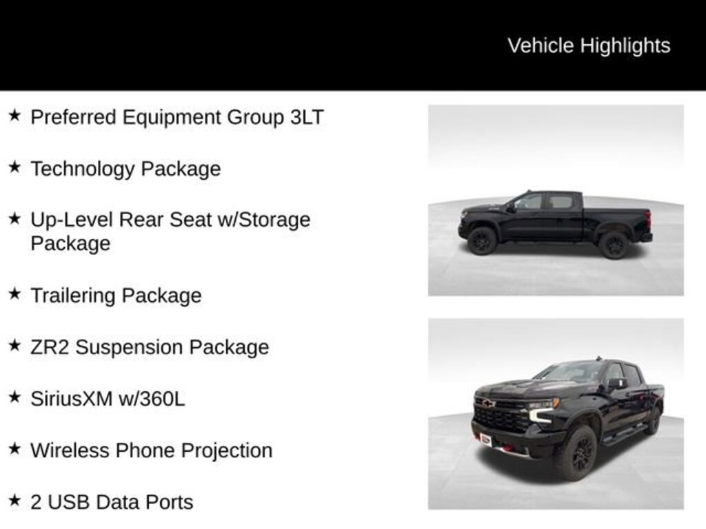 Certified.Black ZR2 4WD EcoTec3 6.2L V810-Way Power Driver Seat w/Lumbar, 10-Way Power Passenger Seat Adjuster w/Lumbar, 12.3 Multicolor Reconfigurable Digital Display, 120-Volt Bed Mounted Power Outlet, 120-Volt Instrument Panel Power Outlet, 15 Diagonal Multicolor Head-Up Display, 170 Amp Alternator, 2 USB Data Ports, 2nd Row Heated Outboard Seats, Adaptive Cruise Control, All-Weather Floor Liner (LPO), Auto-Dimming Inside Rear-View Mirror, Auto-Locking Rear Differential, Bed View Camera, Bluetooth® For Phone, Chevrolet Connected Access Capable, Chevytec Spray-On Black Bedliner, Color-Keyed Carpeting Floor Covering, Compass, Deep-Tinted Glass, Driver Memory, Dual Exhaust, Dual Rear USB Ports (Charge Only), Electric Rear-Window Defogger, Electrical Steering Column Lock, Electronic Cruise Control, EZ Lift Power Lock & Release Tailgate, Floor Mounted Center Console, Front LED Fog Lamps, Front Rainsensing Wipers, HD Surround Vision, Heated Driver & Front Outboard Passenger Seats, Heated Steering Wheel, Heavy-Duty Air Filter, High Gloss Black Mirror Caps, Hill Descent Control, Hitch Guidance, Hitch Guidance w/Hitch View, Integrated Trailer Brake Controller, Keyless Open & Start, Leather Wrapped Steering Wheel, LED Cargo Area Lighting, Manual Tilt/Telescoping Steering Column, OnStar & Chevrolet Connected Services Capable, Outside Heated Power-Adjustable Mirrors, Performance Red Recovery Hooks, Perimeter Lighting, Power Front Passenger Windows w/Express Up/Down, Power Front Windows w/Driver Express Up/Down, Power Rear Windows w/Express Down, Power Sliding Rear Window w/Rear Defogger, Power Tilt & Telescoping Steering Column, Preferred Equipment Group 3LT, Rear Camera Mirror, Rear Cross Traffic Alert-Braking, Rear Park Assist, Rear Pedestrian Detection, Rear Wheelhouse Liners, Remote Vehicle Starter System, Safety Alert Seat, SiriusXM w/360L, Standard Tailgate, Steering Wheel Audio Controls, Technology Package, Theft Deterrent System (Unauthorized Entry), Trailer Camera Provisions, Trailer Side Blind Zone Alert, Trailering App, Trailering Package, Universal Home Remote, Up-Level Rear Seat w/Storage Package, Ventilated Driver & Front Passenger Seats, Wi-Fi Hot Spot Capable, Wireless Charging, Wireless Phone Projection, ZR2 Suspension Package.Here at Karl Chevrolet of Stuart we want to help you find the best vehicle to suit your needs. With our huge selection of new and pre-owned vehicles, we're sure to have the right car for you! We pride ourselves on creating a friendly buying experience and earning the title of Your Dealer for Life. Give us a call at 515.523.1201 and speak to our experts to find out just how easy it is to get the vehicle of your dreams!*Equipment and options are generated by a 3rd party vendor, exact vehicle options may vary. Please see a salesperson for complete details and vehicle information.Clean CARFAX. CARFAX One-Owner.Certification Program Details: Karl Chevrolet of Stuart, your newest CarBravo dealer, where platinum quality vehicles and unmatched benefits come together! -Comprehensive Limited Bumper to Bumper Warranty. -24/7 Roadside Assistance: -Multi-Point Vehicle Inspection: Every vehicle undergoes a Platinum Quality Certified Inspection known throughout the industry to ensure top quality. -Vehicle Exchange Program. Within 10-Days and 500 miles -Complimentary Vehicle History Report -Nationwide Dealer Network Support: Enjoy the backing of the extensive CarBravo and GM dealership network. -OnStar and SiriusXM Trials: Enjoy connected services and entertainment with included trial subscriptions. -Terms and conditions may apply. With every vehicle purchased, you'll enjoy the peace of mind that comes with a limited warranty, 24/7 roadside assistance, and a comprehensive vehicle inspection.