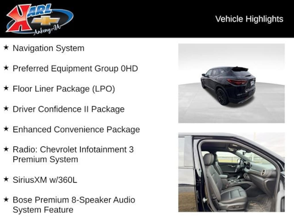With its stunning good looks, impressive performance, and exceptional feature set, this 2024 Chevrolet Blazer Premier 4DR AWD PREMIER is a true standout in the midsize SUV segment. Experience the difference for yourself by scheduling a test drive at Karl Chevrolet of Ankeny today.