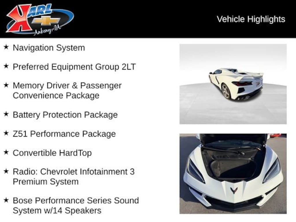 Recent Arrival! CARFAX One-Owner, Local Trade & Sold New at Karls! Clean CARFAX. Certified. Arctic White 2024 Chevrolet Corvette Stingray 2DR STINGRAY CONV W/ 6.2L V8 2 Cargo Nets, Auto High-beam Headlights, Battery Protection Package, Bose Performance Series Sound System w/14 Speakers, Convertible HardTop, Convertible roof lining, Driver Power Bolster Seat Adjuster, Electrical Theft Deterrent System, Electronic Limited-Slip Differential, Exterior Parking Camera Rear, Front dual zone A/C, HD Front & Rear Vision Cameras, Head-Up Display, Heated & Vented Driver & Passenger Seats, Heated Steering Wheel, Heavy-Duty Cooling System, Lane Departure Warning System, Memory Driver & Passenger Convenience Package, Memory seat, Navigation System, Passenger Power Bolster Seat Adjuster, Performance Data & Video Recorder, Performance Exhaust w/Stainless-Steel Tips, Performance Rear Axle Ratio, Power-Adjustable Outside Heated Mirrors, Preferred Equipment Group 2LT, Radio: Chevrolet Infotainment 3 Premium System, Rear Cross Traffic Alert, Rear Z51 Spoiler, Side Blind Zone Alert, Universal Home Remote, Vehicle Inclination Theft Deterrent Sensor, Vehicle Interior Movement Theft Deterrent Sensor, Wheels: 19 x 8.5 Fr/20 x 11 Rr Bright Silver, Wireless Charging for Devices, Z51 Performance Brakes, Z51 Performance Package, Z51 Performance Suspension. 16/25 City/Highway MPG 8-Speed Dual Clutch RWDAt Karl Chevrolet we want to help you find the best new or used car in Ankeny that suits your needs. Check out the 2024 Chevrolet Corvette For Sale in Ankeny, IA. When you buy a new car at Karl Chevrolet you know you're finding a vehicle you can rely on. We have a great selection of Platinum Quality Pre-Owned Vehicles. We also pride ourselves in creating a friendly atmosphere and reliable new car dealership that you can trust. Call us with any questions about our 2024 Chevrolet Corvette and our experts will be glad to help you! (515) 299-4300. *Equipment and options are generated by a 3rd party vendor, exact vehicle options may vary. Please see a salesperson for complete details and vehicle information.Certification Program Details: Karl Chevrolet of Ankeny, your newest CarBravo dealer, where platinum quality vehicles and unmatched benefits come together! -Comprehensive Limited Bumper to Bumper Warranty. -24/7 Roadside Assistance: -Multi-Point Vehicle Inspection: Every vehicle undergoes a Platinum Quality Certified Inspection known throughout the industry to ensure top quality. -Vehicle Exchange Program. Within 10-Days and 500 miles -Complimentary Vehicle History Report -Nationwide Dealer Network Support: Enjoy the backing of the extensive CarBravo and GM dealership network. -OnStar and SiriusXM Trials: Enjoy connected services and entertainment with included trial subscriptions. -Terms and conditions may apply. With every vehicle purchased, you'll enjoy the peace of mind that comes with a limited warranty, 24/7 roadside assistance, and a comprehensive vehicle inspection.
