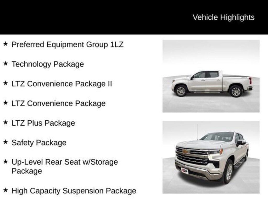 10-Way Power Driver Seat w/Lumbar, 10-Way Power Passenger Seat Adjuster w/Lumbar, 12.3 Multicolor Reconfigurable Digital Display, 120-Volt Bed Mounted Power Outlet, 120-Volt Interior Power Outlet, 15 Diagonal Multicolor Head-Up Display, 2 USB Data Ports, 2nd Row Heated Outboard Seats, Adaptive Cruise Control, Auto-Dimming Inside Rear-View Mirror, Auto-Locking Rear Differential, Bed View Camera, Bluetooth® For Phone, Chevrolet Connected Access Capable, Chrome Mirror Caps, Color-Keyed Carpeting Floor Covering, Deep-Tinted Glass, Driver Memory, Dual Rear USB Ports (Charge Only), Electric Rear-Window Defogger, Electrical Steering Column Lock, Electronic Cruise Control, Floor Mounted Center Console, Front Frame-Mounted Black Recovery Hooks, Front LED Fog Lamps, Front Rain-Sensing Wipers, Front Rubberized Vinyl Floor Mats, HD Surround Vision, Heated Driver & Front Outboard Passenger Seats, Heated Steering Wheel, High Capacity Suspension Package, Hitch Guidance, Hitch Guidance w/Hitch View, In-Vehicle Trailering System App, Integrated Trailer Brake Controller, Keyless Open & Start, LED Cargo Area Lighting, LTZ Convenience Package, LTZ Convenience Package II, LTZ Plus Package, OnStar & Chevrolet Connected Services Capable, Outside Heated Power-Adjustable Mirrors, Perimeter Lighting, Power Front Passenger Windows w/Express Up/Down, Power Front Windows w/Driver Express Up/Down, Power Rear Windows w/Express Down, Power Sliding Rear Window w/Rear Defogger, Power Tailgate, Power Tilt & Telescoping Steering Column, Preferred Equipment Group 1LZ, Premium Bose 7-Speaker Sound System, Rear Camera Mirror, Rear Cross Traffic Braking, Rear Pedestrian Alert, Rear Rubberized-Vinyl Floor Mats, Rear Wheelhouse Liners, Remote Vehicle Starter System, Safety Alert Seat, Safety Package, SiriusXM w/360L, Standard Tailgate, Steering Wheel Audio Controls, Technology Package, Theft Deterrent System (Unauthorized Entry), Trailer Camera Provisions, Trailer Side Blind Zone Alert, Trailering Package, Ultrasonic Front & Rear Park Assist, Universal Home Remote, Up-Level Rear Seat w/Storage Package, Ventilated Driver & Front Passenger Seats, Wi-Fi Hot Spot Capable, Wireless Charging, Wrapped Steering Wheel.