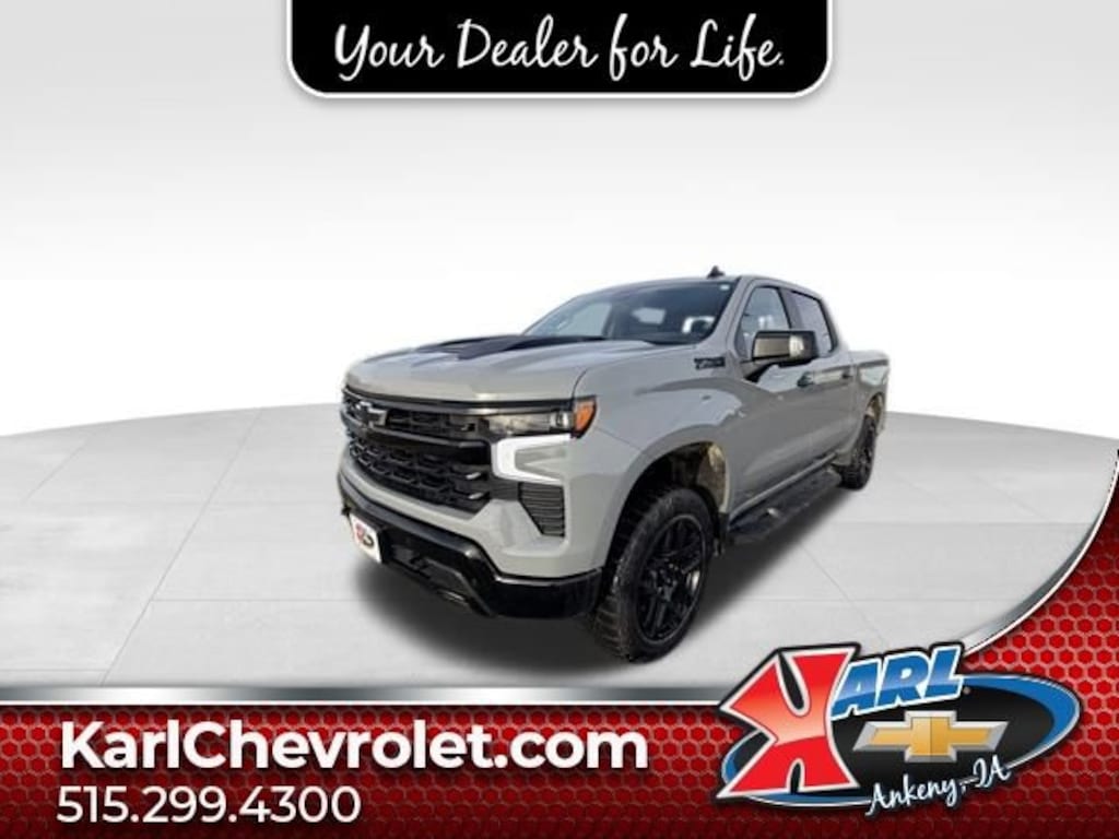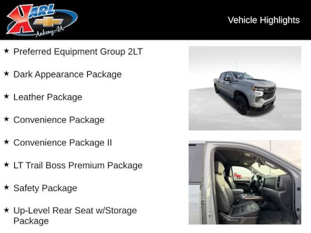 Recent Arrival! CARFAX One Owner & Local Trade! Equipped With Running Boards! Certified. Slate Gray Metallic 2024 Chevrolet Silverado 1500 LT Trail Boss 4WD CREW 147 EcoTec3 6.2L V8 10-Speed Automatic, 4WD, Black Leather, 12.3 Multicolor Reconfigurable Digital Display, 6-Speaker Audio System, All-Weather Floor Liner (LPO) (AAK), Auto High-beam Headlights, Auto-Locking Rear Differential, Bed View Camera, Black Chrome Exhaust Tip (LPO), Black Tailgate CHEVROLET Lettering (LPO), Bluetooth® For Phone, Chevrolet Connected Access Capable, Chevytec Spray-On Black Bedliner, Color-Keyed Carpeting Floor Covering, Convenience Package, Convenience Package II, Dark Appearance Package, Deep-Tinted Glass, Dual Rear USB Ports (Charge Only), Dual-Zone Automatic Climate Control, Electric Rear-Window Defogger, Electrical Steering Column Lock, Electronic Cruise Control, EZ Lift Power Lock & Release Tailgate, Forward Collision Alert, Front Frame-Mounted Black Recovery Hooks, Front LED Fog Lamps, HD Rear Vision Camera, HD Surround Vision, Heated Driver & Front Outboard Passenger Seats, Heated Power-Adjustable Outside Mirrors, Heated Steering Wheel, Heavy-Duty Air Filter, High Gloss Black Mirror Caps, Hill Descent Control, Hitch Guidance w/Hitch View, In-Vehicle Trailering System App, Inside Rear-View Mirror w/Tilt, Integrated Trailer Brake Controller, Keyless Open & Start, Lane Keep Assist w/Lane Departure Warning, Leather Package, Leather-Appointed Front Seat Trim, LED Cargo Area Lighting, LT Trail Boss Premium Package, OnStar & Chevrolet Connected Services Capable, Performance Red Recovery Hooks, Perimeter Lighting, Power driver seat, Power Sliding Rear Window w/Rear Defogger, Power Tailgate, Power windows, Preferred Equipment Group 2LT, Premium Bose 7-Speaker Sound System, Protection Package, Rear 60/40 Folding Bench Seat (Folds Up), Rear Cross Traffic Braking, Rear Pedestrian Alert, Rear Wheelhouse Liners, Remote Vehicle Starter System, Safety Package, Single Outlet Exhaust, SiriusXM w/360L, Standard Tailgate, Steering Wheel Audio Controls, Suspension Package, Theft Deterrent System (Unauthorized Entry), Trailer Camera Provisions, Trailer Side Blind Zone Alert, Trailering Package, Ultrasonic Front & Rear Park Assist, Universal Home Remote, Up-Level Rear Seat w/Storage Package, Wheels: 20 x 9 High Gloss Black Painted Alum, Wi-Fi Hot Spot Capable, Wireless Charging, Wrapped Steering Wheel. 14/17 City/Highway MPG 10-Speed Automatic 4WDCertification Program Details: Karl Chevrolet of Ankeny, The Nation's #1 CarBravo certified dealer, where platinum quality vehicles and unmatched benefits come together! This vehicle qualifies for our CarBravo Certified program reserved for the highest-quality pre-owned vehicles that are 10 model years or newer and have less than 100,000 miles. Every CarBravo Certified vehicle includes: ? Comprehensive 126-Point Inspection Professionally inspected by factory-trained technicians to meet strict mechanical, safety, and cosmetic standards. ? 6-Month / 6,000-Mile Bumper-to-Bumper Limited Warranty Enjoy added peace of mind with extensive coverage from the day you drive off the lot. ? 24/7 Roadside Assistance & Courtesy Transportation Flat tire? Dead battery? Need a tow? You're covered anywhere, anytime throughout the warranty period. ? Vehicle History & Title Guarantee Clean title, completed safety recalls, and a full CARFAX® or AutoCheck® report provided for complete transparency. ? 10-Day / 500-Mile Exchange Promise If you don't absolutely love it, bring it back and exchange it no hassle, no stress. Experience peace of mind and premium protection exclusively from Karl Chevrolet of Ankeny, the Nation's #1 CarBravo Certified Deale