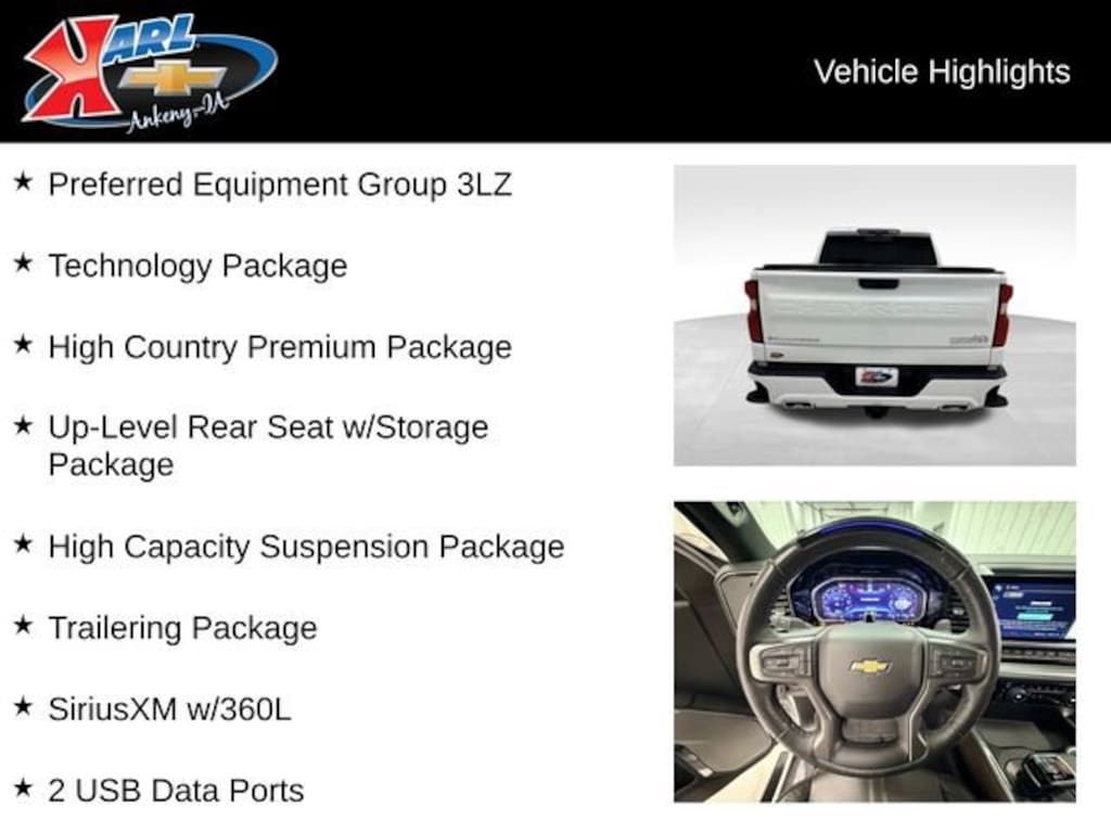 Certification Program Details: Karl Chevrolet of Ankeny, The Nation's #1 CarBravo certified dealer, where platinum quality vehicles and unmatched benefits come together! This vehicle qualifies for our CarBravo Certified program reserved for the highest-quality pre-owned vehicles that are 10 model years or newer and have less than 100,000 miles. Every CarBravo Certified vehicle includes: ? Comprehensive 126-Point Inspection Professionally inspected by factory-trained technicians to meet strict mechanical, safety, and cosmetic standards. ? 6-Month / 6,000-Mile Bumper-to-Bumper Limited Warranty Enjoy added peace of mind with extensive coverage from the day you drive off the lot. ? 24/7 Roadside Assistance & Courtesy Transportation Flat tire? Dead battery? Need a tow? You're covered anywhere, anytime throughout the warranty period. ? Vehicle History & Title Guarantee Clean title, completed safety recalls, and a full CARFAX® or AutoCheck® report provided for complete transparency. ? 10-Day / 500-Mile Exchange Promise If you don't absolutely love it, bring it back and exchange it no hassle, no stress. Experience peace of mind and premium protection exclusively from Karl Chevrolet of Ankeny, the Nation's #1 CarBravo Certified Deale