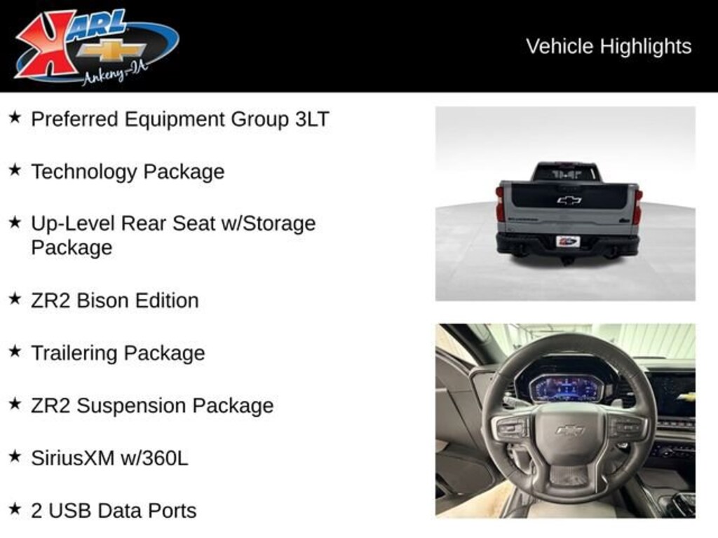 Recent Arrival! CARFAX One Owner & Local Trade! Equipped With Running Boards! Clean CARFAX. Certified. Slate Gray Metallic 2024 Chevrolet Silverado 1500 ZR2 4WD CREW CAB 147 ZR2 3.0L I6 10-Speed Automatic, 4WD, Jet Black/Graystone Leather, 12.3 Multicolor Reconfigurable Digital Display, 15 Diagonal Multicolor Head-Up Display, 2 USB Data Ports, 2nd Row Heated Outboard Seats, Adaptive Cruise Control, AEV Front Bumper, AEV Fuel Tank Skid Plate, AEV Rear Bumper, Auto High-beam Headlights, Auto-Dimming Inside Rear-View Mirror, Bed View Camera, Bluetooth® For Phone, Chevytec Spray-On Black Bedliner, Deep-Tinted Glass, Driver Memory, Dual Rear USB Ports (Charge Only), Electric Rear-Window Defogger, Electrical Steering Column Lock, Electronic Cruise Control, EZ Lift Power Lock & Release Tailgate, Forward Collision Alert, Front LED Fog Lamps, Front Rain-Sensing Wipers, HD Surround Vision, Heated Driver & Front Outboard Passenger Seats, Heated Steering Wheel, Heavy-Duty Air Filter, High Gloss Black Mirror Caps, Hill Descent Control, Hitch Guidance, Hitch Guidance w/Hitch View, In-Vehicle Trailering System App, Integrated Trailer Brake Controller, Keyless Open & Start, Lane Keep Assist w/Lane Departure Warning, LED Cargo Area Lighting, Manual Tilt/Telescoping Steering Column, Multi-Flex Tailgate, OnStar & Chevrolet Connected Services Capable, Outside Heated Power-Adjustable Mirrors, Performance Red Recovery Hooks, Perimeter Lighting, Power driver seat, Power Sliding Rear Window w/Rear Defogger, Power Sunroof, Power Tilt & Telescoping Steering Column, Power windows, Preferred Equipment Group 3LT, Premium Bose 7-Speaker Sound System, Rear Camera Mirror, Rear Cross Traffic Braking, Rear Park Assist, Rear Pedestrian Alert, Rear Wheelhouse Liners, Remote Vehicle Starter System, Rocker Protector (LPO), Safety Alert Seat, SiriusXM w/360L, Standard Tailgate, Steering Wheel Audio Controls, Technology Package, Theft Deterrent System (Unauthorized Entry), Trailer Camera Provisions, Trailer Side Blind Zone Alert, Trailering Package, Ultrasonic Front & Rear Park Assist, Universal Home Remote, Up-Level Rear Seat w/Storage Package, Ventilated Driver & Front Passenger Seats, Wheels: 18 x 8.5 Aluminum AEV, Wi-Fi Hot Spot Capable, Wrapped Steering Wheel, ZR2 Bison Edition, ZR2 Suspension Package. 20/22 City/Highway MPG 10-Speed Automatic 4WD