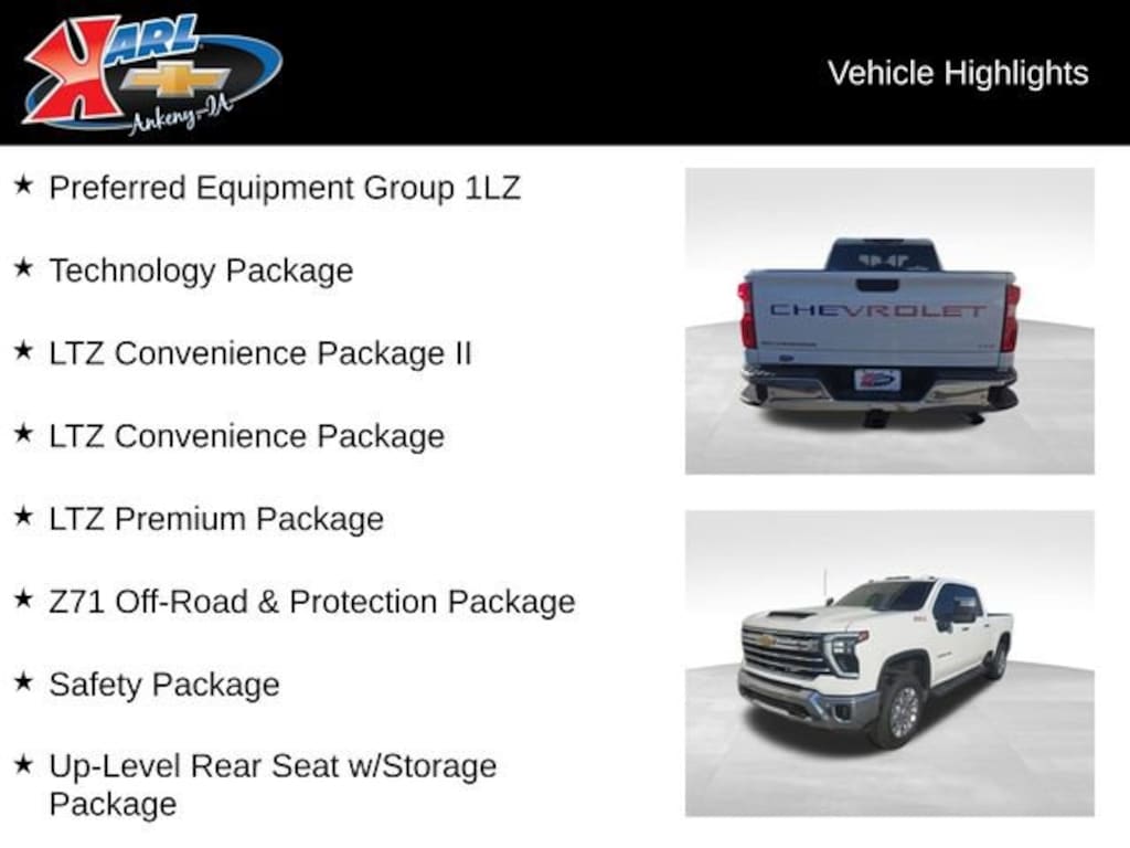 Recent Arrival! CARFAX Sold New at Karls. Equipped With Running Boards & Bed Liner! Clean CARFAX. Certified. Summit White 2024 Chevrolet Silverado 2500HD LTZ 4WD CREW CAB 159 LT 6.6L V8 10-Speed Automatic, 4WD, Jet Black Leather, 120-Volt Bed Mounted Power Outlet, 120-Volt Interior Power Outlet, 15 Diagonal Multicolor Head-Up Display, 170 Amp Alternator, 1st & 2nd Row All-Weather Floor Liners (LPO) (AAK), 2 Charge/Data USB Ports Inside Center Console, 220 Amp Alternator, 5th Wheel & Gooseneck Trailer Wiring Provisions, 6-Speaker Audio System, Adaptive Cruise Control, Apple CarPlay/Android Auto, Auto High-beam Headlights, Auto-Dimming Inside Rear-View Mirror, Bed View Camera w/2 Trailer Camera Provisions, Bluetooth® For Phone, BOSE Premium 7-Speaker Sound System, Chevrolet Connected Access Capable, Chrome Door Handles, Chrome Mirror Caps, Color-Keyed Carpeting Floor Covering, Compass, Deep-Tinted Glass, Electric Rear-Window Defogger, Electronic Cruise Control w/Set & Resume Speed, EZ Lift Power Lock & Release Tailgate, Floor-Mounted Center Console, Front Bucket Seats, Front dual zone A/C, Front LED Fog Lamps, Front Rain-Sensing Wipers, Front Rubberized Vinyl Floor Mats, HD Rear Vision Camera, HD Surround Vision, Heated 2nd Row Outboard Seats, Heated Driver & Front Outboard Passenger Seating, Heated Steering Wheel, Hill Descent Control, Hitch Guidance w/Hitch View, In-Vehicle Trailering App System, Keyless Open & Start, LED Cargo Area Lighting, LED Smoked Amber Roof Marker Lamps, LED Taillamps w/Fixed Signature, LTZ Convenience Package, LTZ Convenience Package II, LTZ Premium Package, Manual Tilt & Telescoping Steering Column, Memory seat, Off-Road Suspension, OnStar & Chevrolet Connected Services Capable, Power Door Locks, Power Front Windows w/Driver Express Up/Down, Power Front Windows w/Passenger Express Up/Down, Power Rear Windows w/Express Down, Power Sliding Rear Window w/Defogger, Preferred Equipment Group 1LZ, Push Button Start, Rear Camera Mirror, Rear Cross Traffic Alert, Rear Rubberized Vinyl Floor Mats, Rear Wheelhouse Liners, Remote Vehicle Starter System, Safety Alert Seat, Safety Package, SiriusXM w/360L, Snow Plow Prep/Camper Package, Standard Tailgate, Steering Wheel Audio Controls, Suspension Package, Technology Package, Trailer Camera Provisions, Trailer Side Blind Zone Alert, Ultrasonic Front & Rear Park Assist, Unauthorized Entry Theft-Deterrent System, Universal Home Remote, Up-Level Rear Seat w/Storage Package, Ventilated Driver & Front Passenger Seats, Wheels: 20 12-Spoke Bright Chrome (DISC), Wi-Fi Hotspot Capable, Wireless Charging, Wireless Phone Projection, Wrapped Steering Wheel, Z71 Off-Road & Protection Package, Z71 Off-Road Package. 10-Speed Automatic 4WD