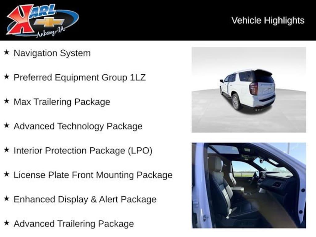 Experience the unparalleled capability, technology, and luxury of the 2024 Chevrolet Tahoe Premier. Visit Karl Chevrolet of Ankeny today and let our team of experts guide you through this exceptional vehicle. We're confident you'll be impressed by its impressive features and exceptional value.