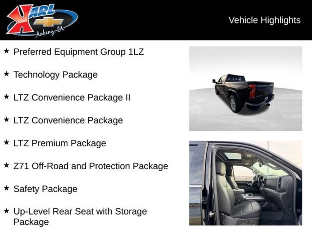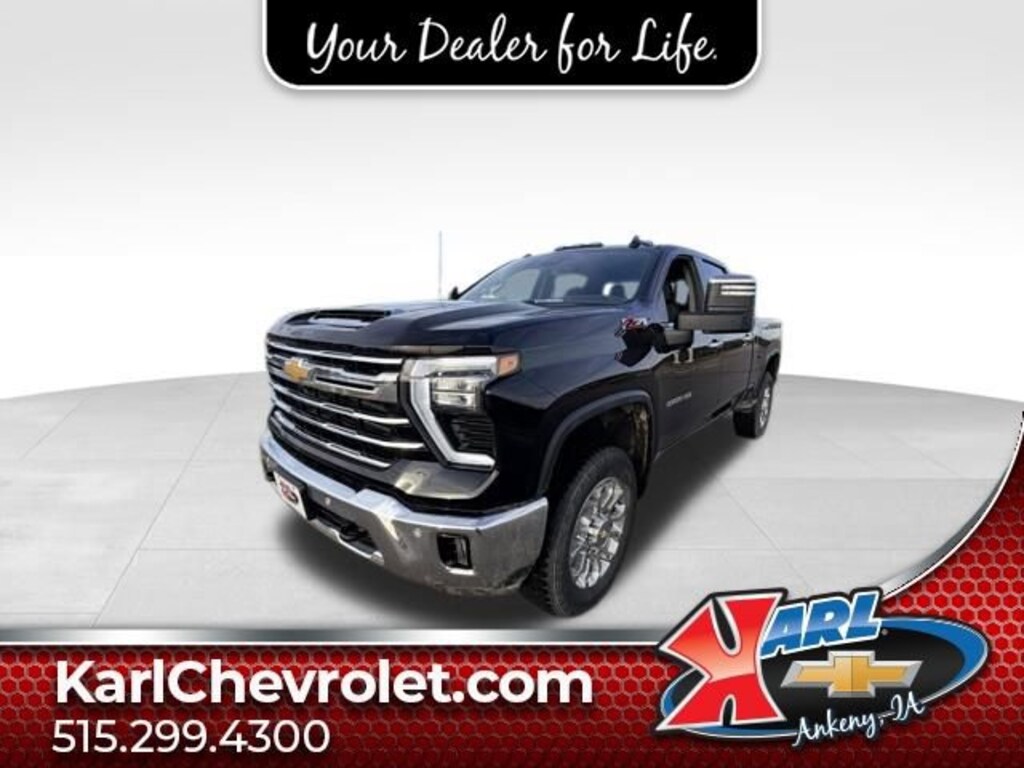 Recent Arrival! CARFAX One Owner & Local Trade! Clean CARFAX. Certified. Black 2025 Chevrolet Silverado 2500HD LTZ 4WD CREW CAB 159 LTZ Duramax 6.6L V8 Turbodiesel 10-Speed Automatic, 4WD, Jet Black Leather, 15 Diagonal Multicolor Head-Up Display, 170 Amp Alternator, 1st and 2nd Row All-Weather Floor Liners, 3.73 Rear Axle Ratio, 6-Speaker Audio System, Adaptive Cruise Control, Apple CarPlay/Android Auto, Auto High-beam Headlights, Auto-Dimming Inside Rear-View Mirror, Bed View Camera with Two Trailer Camera Provisions, Black Chevytec Spray-on Bedliner, Bluetooth® For Phone, BOSE Premium 7-Speaker Sound System, Chrome Door Handles, Chrome Mirror Caps, Deep-Tinted Glass, Durabed Pickup Bed, Electric Rear-Window Defogger, Electronic Cruise Control with Set and Resume Speed, EZ Lift Power Lock and Release Tailgate, Front dual zone A/C, Front LED Fog Lamps, Front Rain-Sensing Wipers, Gooseneck/5th Wheel Prep Package, HD Rear Vision Camera, HD Surround Vision, Heated 2nd Row Outboard Seats, Heated Driver and Front Outboard Passenger Seating, Heated Steering Wheel, Hill Descent Control, Hitch Guidance with Hitch View, in-Vehicle Trailering App System, Keyless Open and Start, LED Cargo Area Lighting, LTZ Convenience Package, LTZ Convenience Package II, LTZ Premium Package, Manual Tilt and Telescoping Steering Column, Off-Road Suspension, OnStar Services Capable, Power Door Locks, Power driver seat, Power Sliding Rear Window with Defogger, Power Sunroof, Power Up/Down Tailgate Function with Power Lock and Release, Power windows, Preferred Equipment Group 1LZ, Push Button Start, Rear Camera Mirror, Rear Cross Traffic Alert, Rear Wheelhouse Liners, Remote Vehicle Starter System, Safety Package, SiriusXM with 360L Trial Subscription, Standard Tailgate, Steering Wheel Audio Controls, Suspension Package, Technology Package, Trailer Camera Provisions, Trailer Side Blind Zone Alert, Ultrasonic Front and Rear Park Assist, Unauthorized Entry Theft-Deterrent System, Universal Home Remote, Up-Level Rear Seat with Storage Package, Ventilated Driver and Front Passenger Seats, Wheels: 18 Machined Aluminum with Silver Painted Accents, Wi-Fi Hotspot Capable, Wireless Charging, Wireless Phone Projection, Wrapped Steering Wheel, Z71 Off-Road and Protection Package, Z71 Off-Road Package. 10-Speed Automatic 4WDCertification Program Details: Karl Chevrolet of Ankeny, The Nation's #1 CarBravo certified dealer, where platinum quality vehicles and unmatched benefits come together! This vehicle qualifies for our CarBravo Certified program reserved for the highest-quality pre-owned vehicles that are 10 model years or newer and have less than 100,000 miles. Every CarBravo Certified vehicle includes: ? Comprehensive 126-Point Inspection Professionally inspected by factory-trained technicians to meet strict mechanical, safety, and cosmetic standards. ? 6-Month / 6,000-Mile Bumper-to-Bumper Limited Warranty Enjoy added peace of mind with extensive coverage from the day you drive off the lot. ? 24/7 Roadside Assistance & Courtesy Transportation Flat tire? Dead battery? Need a tow? You're covered anywhere, anytime throughout the warranty period. ? Vehicle History & Title Guarantee Clean title, completed safety recalls, and a full CARFAX® or AutoCheck® report provided for complete transparency. ? 10-Day / 500-Mile Exchange Promise If you don't absolutely love it, bring it back and exchange it no hassle, no stress. Experience peace of mind and premium protection exclusively from Karl Chevrolet of Ankeny, the Nation's #1 CarBravo Certified Deale