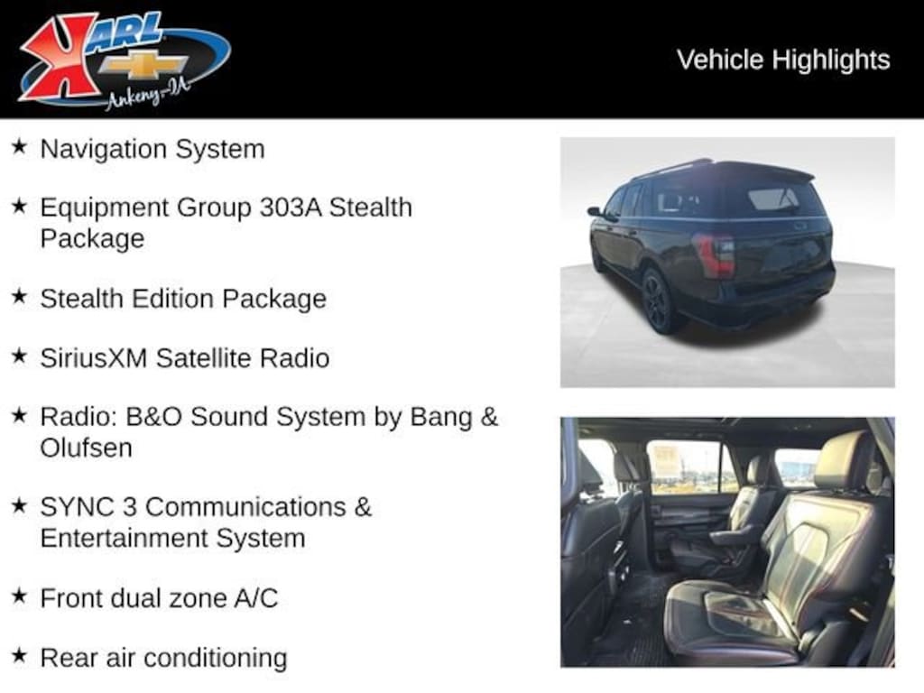 At Karl Chevrolet we want to help you find the best new or used car in Ankeny that suits your needs. Check out the 2021 Ford Expedition Max For Sale in Ankeny, IA. When you buy a new car at Karl Chevrolet you know you're finding a vehicle you can rely on. We have a great selection of Platinum Quality Pre-Owned Vehicles. We also pride ourselves in creating a friendly atmosphere and reliable new car dealership that you can trust. Call us with any questions about our 2021 Ford Expedition Max and our experts will be glad to help you! (515) 299-4300. *Equipment and options are generated by a 3rd party vendor, exact vehicle options may vary. Please see a salesperson for complete details and vehicle information.