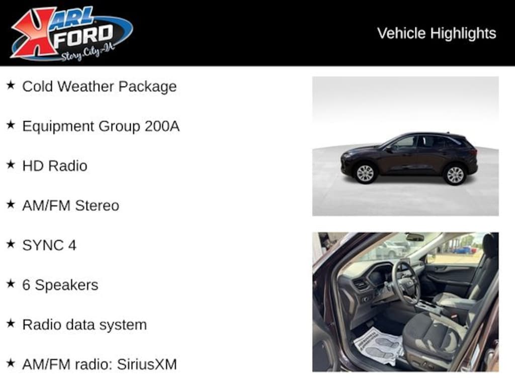 Your Dealer for Life, Karl Ford of Story City. When you buy a new car at Karl Ford of Story City you know you're finding a vehicle you can rely on. We have a great selection of new vehicles for you to test drive around Ames and Des Moines, IA. We also pride ourselves in creating a friendly atmosphere and reliable new car dealership that you can trust. Call us with any questions about our 2023 Ford Escape and our experts will be glad to help you! (515) 733-4364. *Equipment and options are generated by a 3rd party vendor, exact vehicle options may vary. Please see a salesperson for complete details and vehicle information.