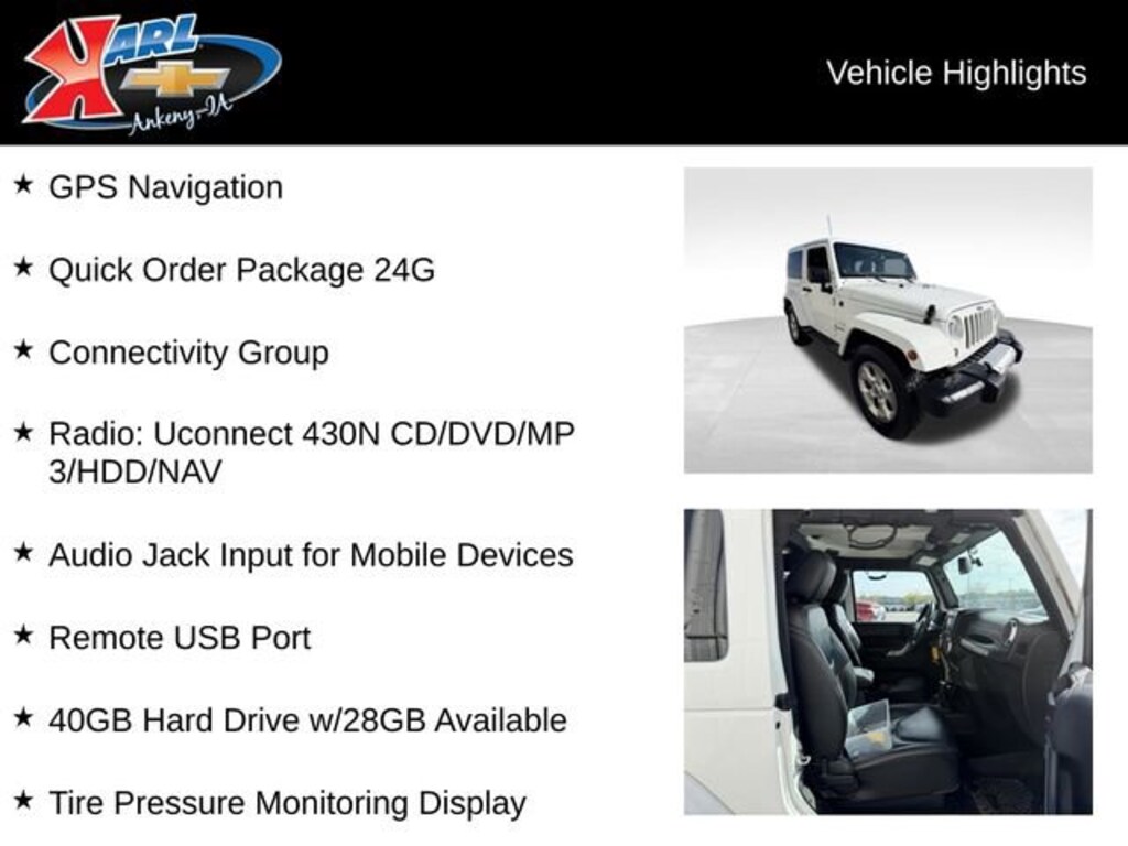 Recent Arrival! Clean CARFAX. Local Trade! Certified. Bright White Clearcoat 2014 Jeep Wrangler Sahara 4WD 2DR SAHARA 3.6L V6 24V VVT 1-Year SIRIUSXM Travel Link Service, 40GB Hard Drive w/28GB Available, 6.5 Touch Screen Display, Alloy wheels, Audio Jack Input for Mobile Devices, Connectivity Group, Delete Sunrider Soft Top, Freedom Panel Storage Bag, GPS Navigation, Heated Front Seats, Power windows, Quick Order Package 24G, Radio: Uconnect 430N CD/DVD/MP3/HDD/NAV, Rear Window Wiper/Washer, Remote Start System, Remote USB Port, SIRIUSXM Travel Link, Tire Pressure Monitoring Display, Vehicle Information Center. 17/21 City/Highway MPG 5-Speed Automatic 4WDAt Karl Chevrolet we want to help you find the best new or used car in Ankeny that suits your needs. Check out the 2014 Jeep Wrangler For Sale in Ankeny, IA. When you buy a new car at Karl Chevrolet you know you're finding a vehicle you can rely on. We have a great selection of Platinum Quality Pre-Owned Vehicles. We also pride ourselves in creating a friendly atmosphere and reliable new car dealership that you can trust. Call us with any questions about our 2014 Jeep Wrangler and our experts will be glad to help you! (515) 299-4300. *Equipment and options are generated by a 3rd party vendor, exact vehicle options may vary. Please see a salesperson for complete details and vehicle information.Certification Program Details: Karl Chevrolet of Ankeny, your newest CarBravo dealer, where platinum quality vehicles and unmatched benefits come together! -Comprehensive Limited Bumper to Bumper Warranty. -24/7 Roadside Assistance: -Multi-Point Vehicle Inspection: Every vehicle undergoes a Platinum Quality Certified Inspection known throughout the industry to ensure top quality. -Vehicle Exchange Program. Within 10-Days and 500 miles -Complimentary Vehicle History Report -Nationwide Dealer Network Support: Enjoy the backing of the extensive CarBravo and GM dealership network. -OnStar and SiriusXM Trials: Enjoy connected services and entertainment with included trial subscriptions. -Terms and conditions may apply. With every vehicle purchased, you'll enjoy the peace of mind that comes with a limited warranty, 24/7 roadside assistance, and a comprehensive vehicle inspection.