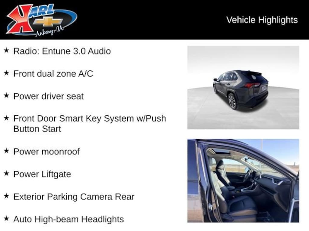 At Karl Chevrolet, we want to help you find the best new or used car in Ankeny that suits your needs. When you buy a new car at Karl Chevrolet, you know you're finding a vehicle you can rely on. We have a great selection of Platinum Quality Pre-Owned Vehicles. We also pride ourselves in creating a friendly atmosphere and a reliable Dealership that you can trust. Call us and our experts will be glad to help you! (515) 299-4300. *Equipment and options are generated by a 3rd party vendor, exact vehicle options may vary. Please see a salesperson for complete details and vehicle information.